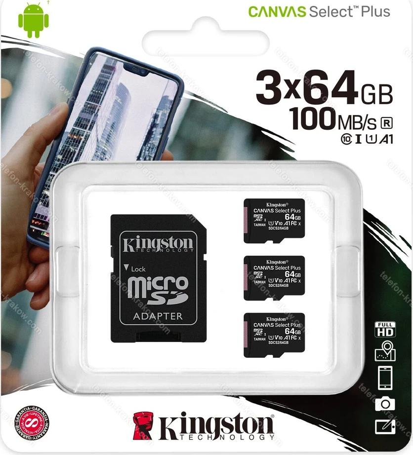 | karta pamięci Kingston Canvas Select Plus R100 microSDXC 64GB Kit, UHS-I U1, A1, Class 10, 3er-Pack kupić Kraków: promocja, sklep internetowy, Polska | | id00863 |